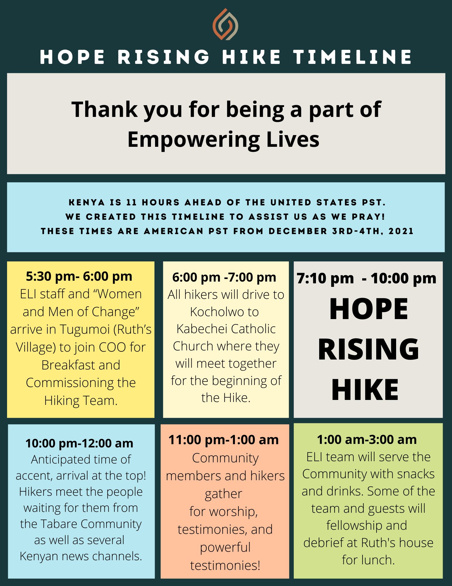 Saturday December 4th elevated the hearts and worship of around two hundred people who gathered in a MOST SURPRISING PLACE in Africa! Many had JUST finished hiking a steep trail from the below in the Kerio Valley to the top of the escarpment along a former delivery route for illegal alcohol. The hikers who finished the climb were exhausted but filled with an overwhelming joy because this was so much MORE THAN A HIKE! It was a three-hour climb and declaration that darkness will NO LONGER HAVE DOMINANCE in that area of Kenya nor in their lives.