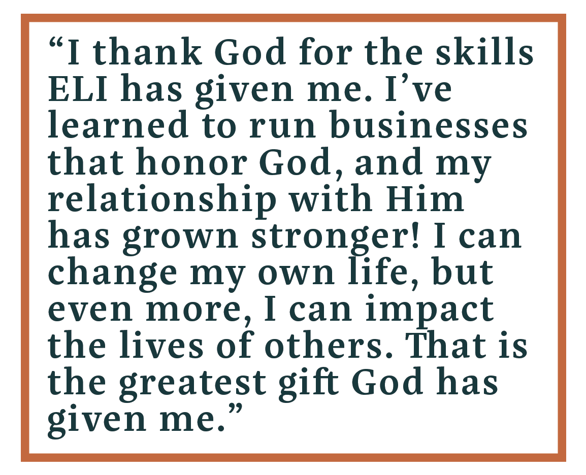 When reflecting on her journey, Sharon shared, “I thank God for the skills ELI has given me. I’ve learned to run businesses that honor God, and my relationship with Him has grown stronger! I can change my own life, but even more, I can impact the lives of others. That is the greatest gift God has given me.”