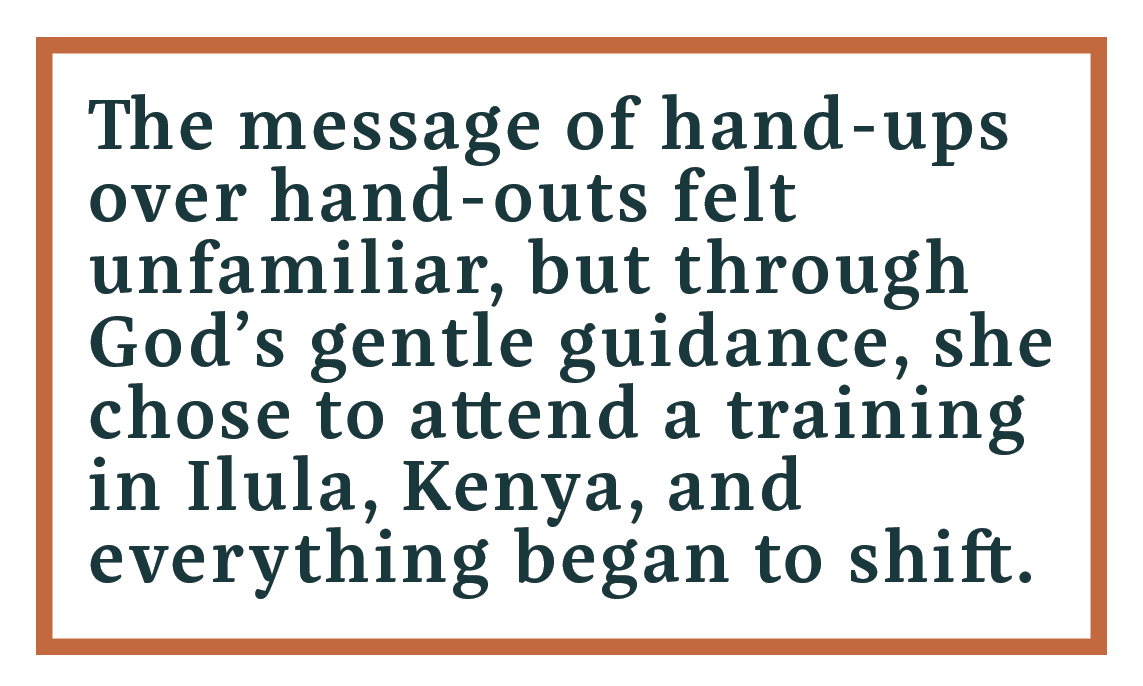 At the time, Faith was involved in an illegal brewing business, doing whatever she could to survive. The message of hand-ups over hand-outs felt unfamiliar, but through God’s gentle guidance, she chose to attend a training in Ilula, Kenya, and everything began to shift.
