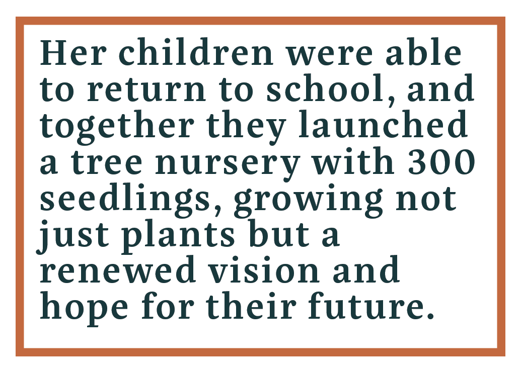 This powerful transformation reached her family as well. Her children were able to return to school, and together they launched a tree nursery with 300 seedlings, growing not just plants but a renewed vision and hope for their future. Most importantly, Faith encountered Christ along the way! What began as a search for provision became a journey of spiritual growth and lasting purpose.