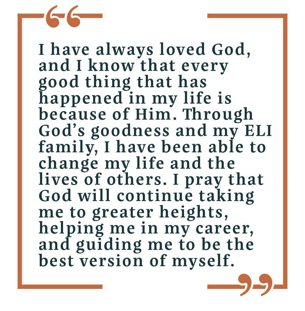“I have always loved God, and I know that every good thing that has happened in my life is because of Him. Through God’s goodness and my ELI family, I have been able to change my life and the lives of others. I pray that God will continue taking me to greater heights, helping me in my career, and guiding me to be the best version of myself.”