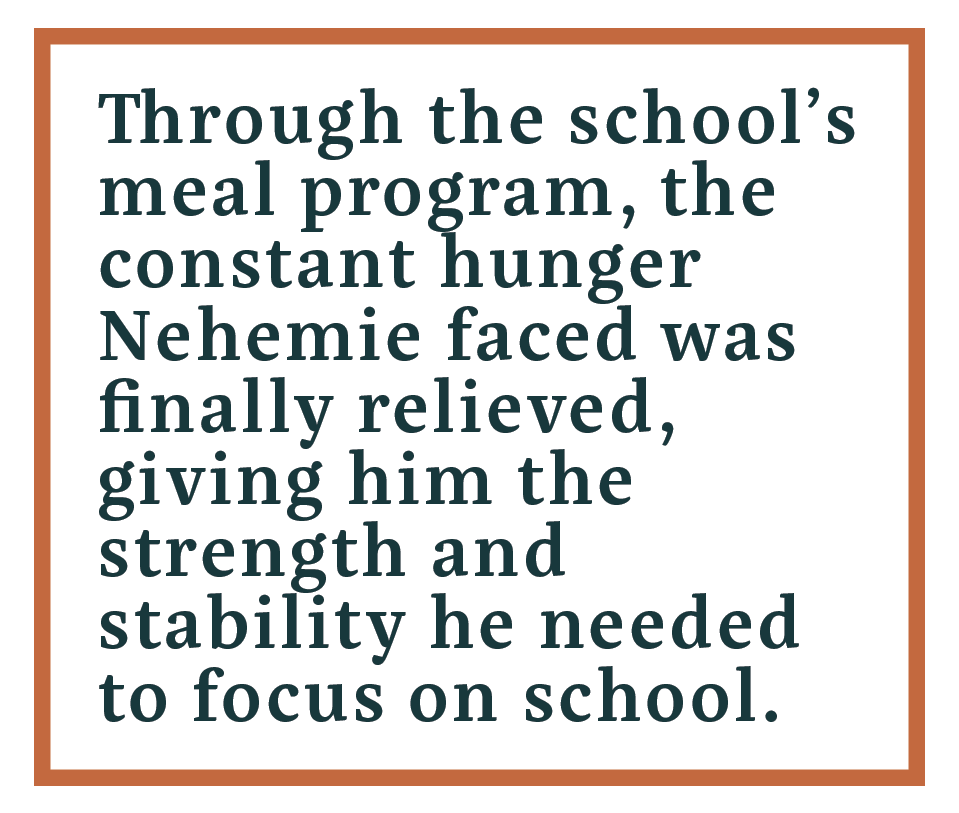Through the school’s meal program, the constant hunger Nehemie faced was finally relieved, giving him the strength and stability he needed to focus on school. While many of his peers were driven by hunger into dangerous paths, Nehemie was protected, and his future was growing brighter by the day.