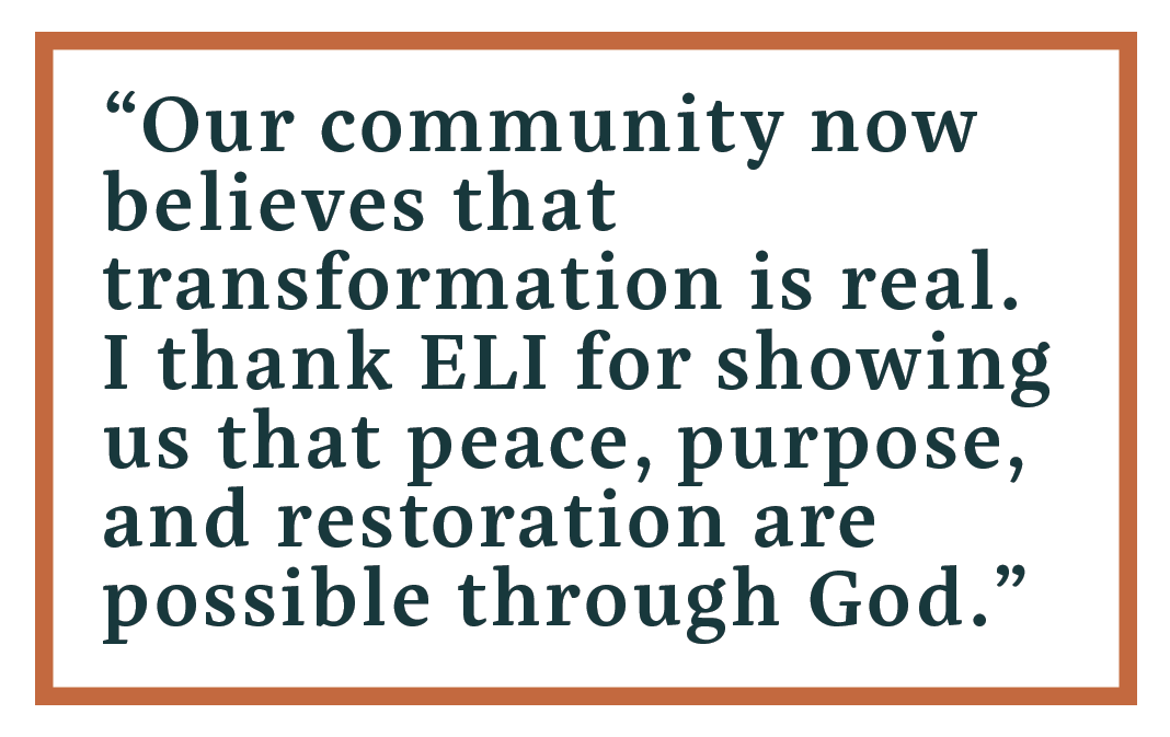 “Our community now believes that transformation is real,” she says. “I thank ELI for showing us that peace, purpose, and restoration are possible through God.”